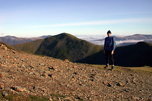 ![]() 14 November: An escaped pixie about to have his lunch in the sun at Hopegill Head (and wondering if the self-timer's working). Grizedale Pike in the background. |