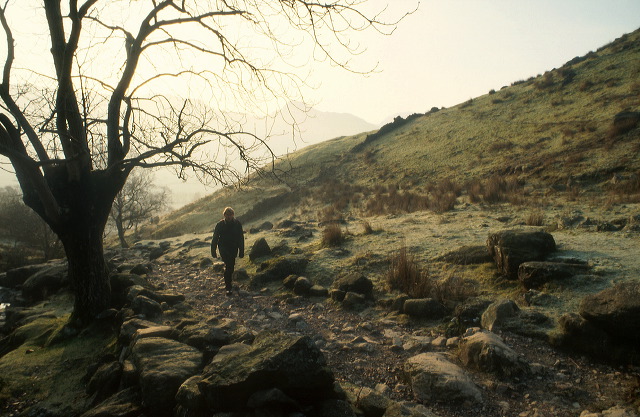 A walker starting the climb up to Stickle Tarn from Great Langdale in misty winter sun