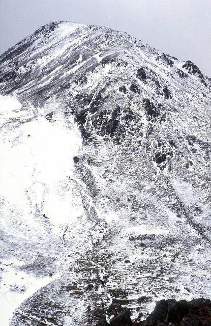 Tiny mountain walkers dwarfed by snow-covered High Crag, on the High Stile ridge