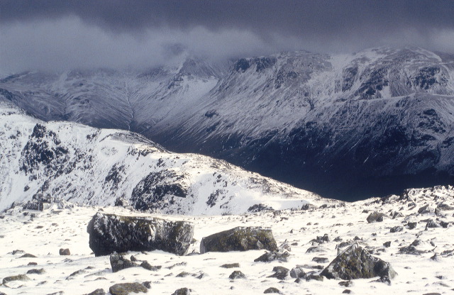 Looking across Buttermere valley from High Stile, with snow underfoot and a heavy sky above