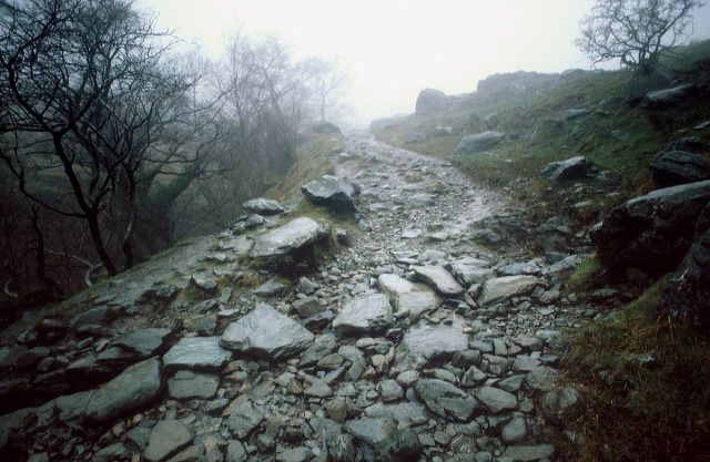 A damp, heavy mist hangs over the stones of the track up to the disused mine in Greenburn, below Wetherlam
