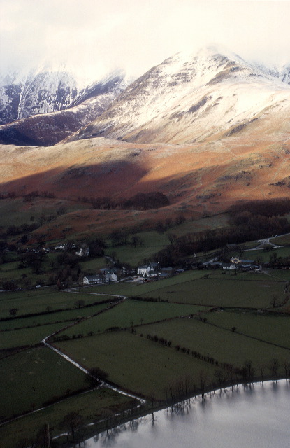 The head of Buttermere from the steep descent from Red Pike on a late winter afternoon, with Grasmoor under snow in the background