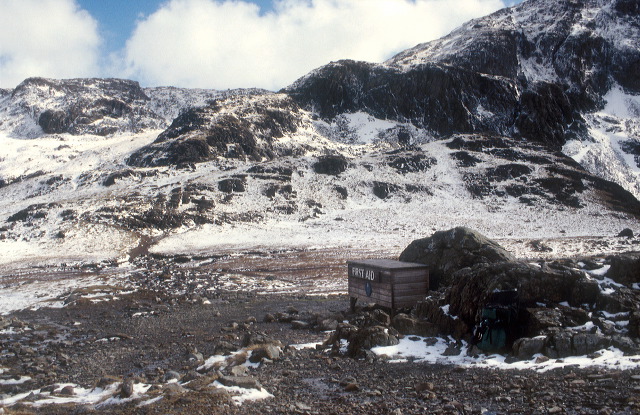 The mountain rescue box at Sty Head. Looking east. Light snow and a hint of sun.