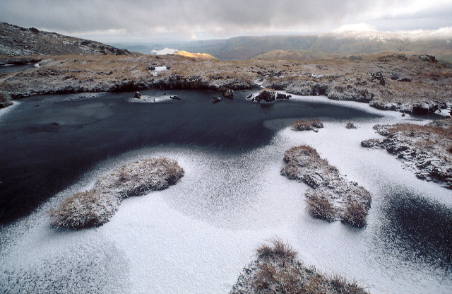 Grass tufts on peat in a small frozen tarn covered with a sprinkling of snow, near the summit cairn of Place Fell