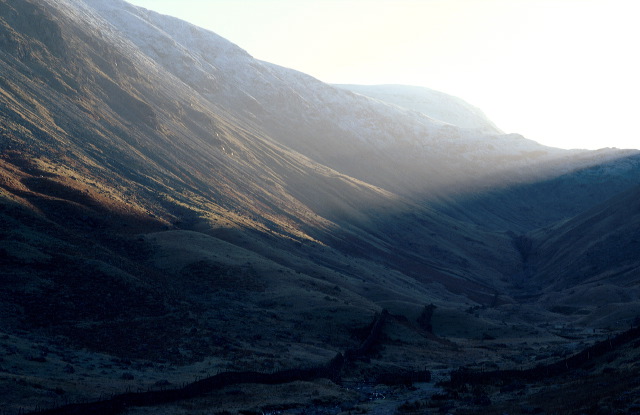 Strong winter sun and a sprinkling of snow in the shadow in Pasture Bottom, below Thornthwaite Crag