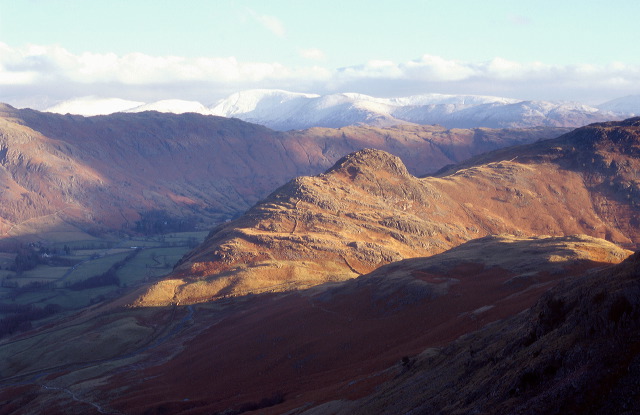 Lingmoor Fell catches the low winter sun in this view from Pike O'Blisco towards Great Langdale, with the Hellvellyn range under snow in the distance