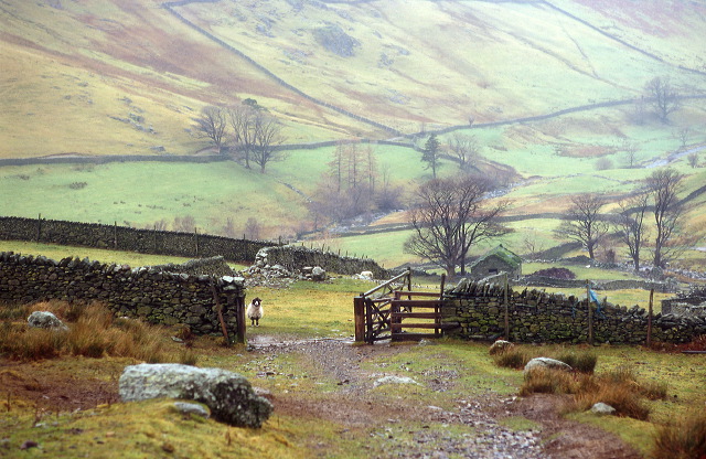 A track through an open gateway in a stone wall, with a valley (somewhere near Great Langdale...) in the background, on a dull wet day. A lone sheep stands by the gate