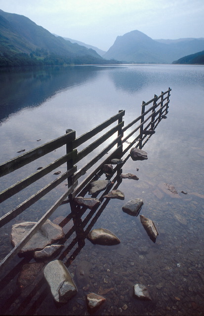 Morning autumn sun and reflection of a fence and rocks in the still surface of Buttermere lake, with Fleetwith Pike in the distance