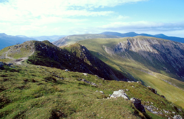 Looking NW from Dale Head to Hindscarth, in autumn sunshine under a blue sky with light cloud, with the peak of Robinson in the distance
