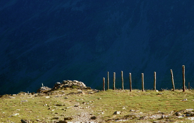 Fenceposts along Littledale Edge (between Robinson and Hindscarth) with the rockface of Fleetwith Pike in shadow in the background
