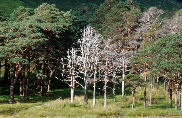 Sun shines on a small wood with a group of dead trees near Gatesgarth, Buttermere