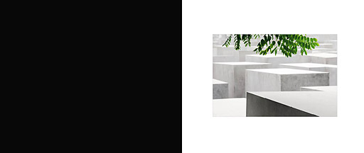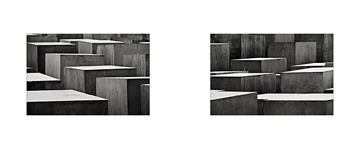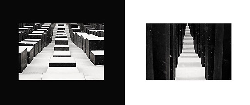 July 2011. "To the Holocaust Memorial, the huge field of marble-like concrete blocks; evenly spaced and yet uneven, the outer blocks like graves. Walking among the tall ones in the centre felt oppressive and disorientating, despite the way out being clear. I spent about 45 minutes taking abstract photos, with the thought of some sort of photo essay in the back of my mind..."