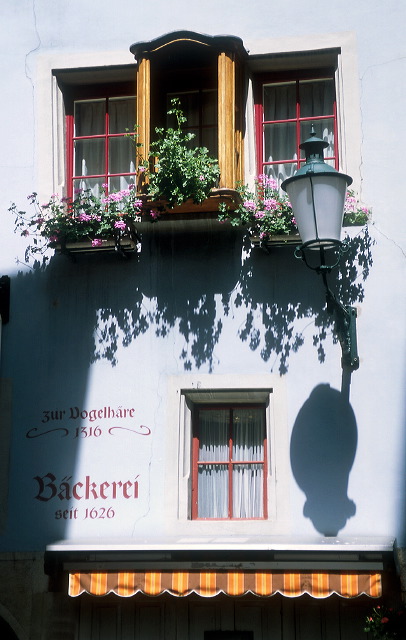 Shadows on the Bakery. Strong midday sun casts sharp shadows of the window boxes and old lamp onto the walls of this 370-year-old baker's shop in Zurich, Switzerland.