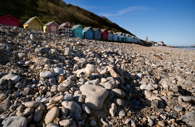 Beach. Down low on the beach at Cromer, on the north Norfolk coast, with my trusty old (1980-ish) manual-focus Nikkor 20mm f/3.5 AI lens on the D800, stopped right down for some pretty good depth of field. I like the shadow from the strong October sun to the right of the central pebble, but in retrospect I think I might have wriggled around a bit more to get a better arrangement of pebbles round the edge of the image; tricky to get that and the distant view right, as the closest stones are inches from the front of the lens.