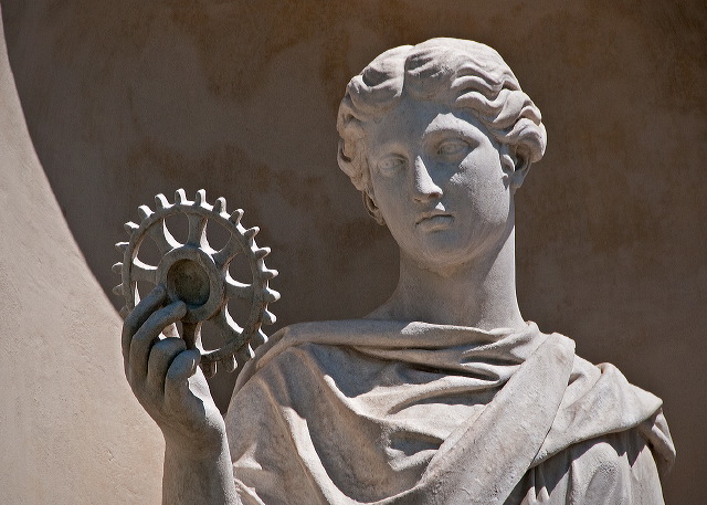 Where Can I Find a Bike Shop?. The Orangerie in Frederick the Great's fabulous Park Sanssouci in Potsdam – south-west of Berlin – was built between 1851 and 1864, and this ("Technology") is one of a number of allegorical statues standing in niches at the front of the building. The carving is exquisite. The sun was very strong and I was careful to avoid clipping the highlights on the light stonework. Nevertheless Adobe Camera Raw has allowed me to pull back the texture of the stone in the highlight areas (not visible too well in this web-size image), and to encourage a little more shadow detail in the wheel. Some tweaks to Levels and Gamma to get the balance of the background just right.