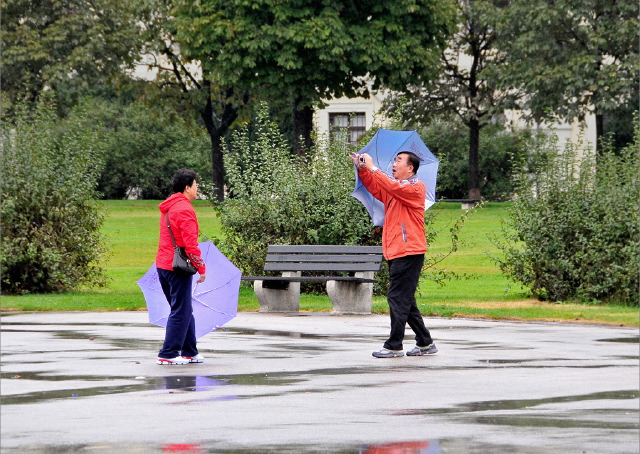 Japanese Camera Dance. A wet day in Vienna, in Heldenplatz in front of the Neue Burg wing of the Hofburg palace. A small group of Japanese tourists was taking photos of each other with the Neue Burg in the background, and here in front of the statue of Archduke Karl on his prancing horse (out of the picture to the left). Like me they were fighting with umbrellas in the strong wind, and probably feeling as fed up with the weather as I was. This couple had a practiced routine and were clearly looking for perfection. I liked their co-ordinated colours. Just time for a couple of grab shots.