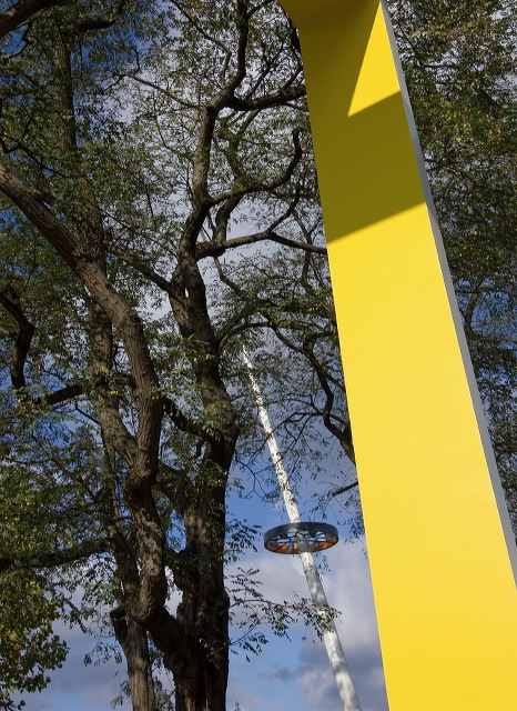 Canopy. A bit of the new outside area at London's South Bank Centre, outside the Royal Festival Hall, with one of the floodlight towers in the background. I hadn't been conscious of the size of the trees before. I was trying to contrast the texture of the tree with the big chunk of yellow painted steel in the foreground. The '4' shadow at the top of the pillar adds some interest. 17/20 and 19/20 in a couple of competitions.
