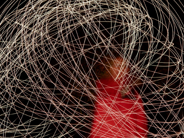 Caught in the Light. At a camera club evening of night photography, my friend Peter made artistic circles with a bare-bulb torch on the end of a length of string for a minute and a half or so, while I held down the shutter release with the speed set to 'Bulb'. Sadly there is no 'Time' setting on modern cameras – in the olden days the shutter could stay open until the release button was pressed a second time. The lens had been focussed before the shot started and then switched to manual. Afterwards, with Long Exposure Noise Reduction switched on (as it always is), another 93 seconds had to pass before the camera could save the image to the card, by which time everyone had gone inside for tea. This final image is 60% of the full frame. There's no significant post-processing, except to remove some reflections from Peter's glasses.
