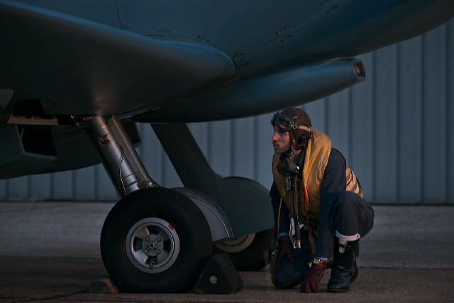 Checking his Spitfire. A Second World War pilot checks under his aircraft before setting out on a mission. Taken (obviously) at a re-enactment evening, this one run by Timeline Events at North Weald airfield. I often feel that images from these sessions can look too “modern” – maybe too sharp or with too much texture – and I worked quite hard in Photoshop to produce a softer, darker image while still keeping some detail.