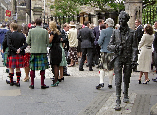 Walking Away. This tall, elegant young man appears to be striding purposefully away, clasping his book, from the tittle-tattle of the wedding guests, and their interesting assortment of legs, footwear, stockings and kilts. A grab-shot outside the Canongate Kirk on the Royal Mile in Edinburgh, at the end of a very chilly mid-September afternoon.