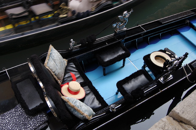 Looking down on a gondola on a canal in Venice; a straw gondolier's hat with a red ribbon lies on the seat, and part of another gondola is seen passing in the background.