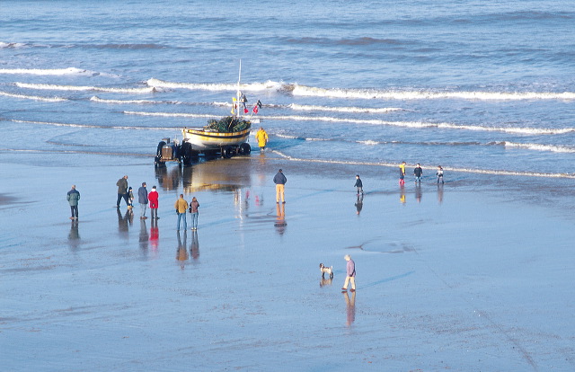 Home from the Sea. On the beach at Cromer on the north Norfolk coast, on New Year's Day 2002 (the East Anglian New Year's Day photo seems to be becoming a tradition!). A small crowd of interested spectators was gathering as the fisherman drove the tractor and trailer into the sea to recover his boat – the only way to do it on this shallow beach – while a perfect blue sky is reflected in the wet sand. The 200mm lens on the F3 again, and Ektachrome E100VS film.
