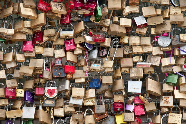 Lovelocked. Travelling in Germany in particular, but also in Austria, I'd noticed a fashion for modern young people to proclaim their love by marking a padlock and fixing it to a railing somewhere, presumably throwing the key into the nearest river (or perhaps not, just in case); the engineering equivalent of carving initials on a tree. Some of the names are even machine-engraved.