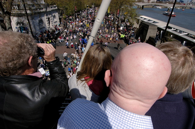 Marathon Watchers. Another shot of the 2005 London Marathon from the Hungerford footbridge over the Thames and the Embankment – a few feet along the bridge from 25 Miles Down – in the short time I had for photography that year. By this time I'd swapped the 200mm for the 12-24mm zoom, and took this at 12mm (35mm equivalent = 18mm) by holding the camera above my head and guessing where to point it, then checking the screen. Three earlier shots were not quite right, but I was pleased with this one. The nice thing about really wide angle lenses is the incredible depth of field.