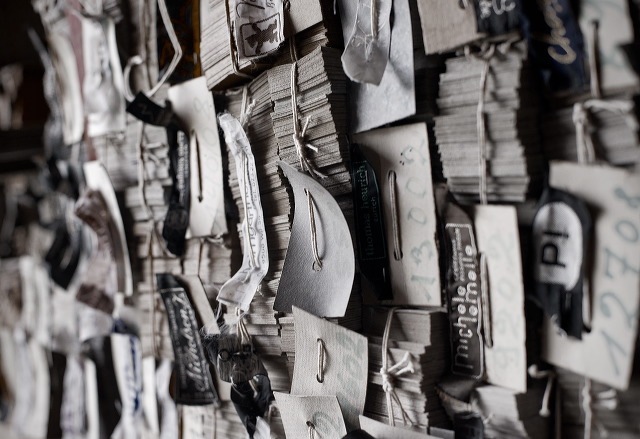 Old Labels. In the Museum für Frühindustrialisierung – the Museum of Early Industrialisation – in Wuppertal, Germany, I came across some shelves storing and displaying these bundles of cards, tied up with string and labelled. In fact the cards are 'programs' for embroidering the (modern) patterns and logos on the beautiful and still-functioning 19th century looms on display.