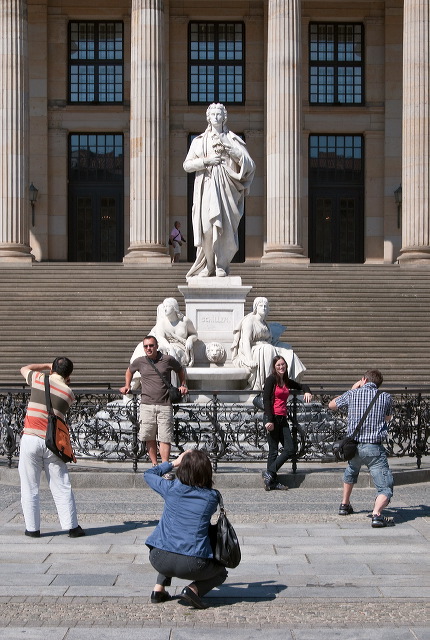 I wanted a nice symmetrical shot of the statue of the great philosopher and playwright Friedrich Schiller in front of the Konzerthaus, but other photographers and their 'models' insisted on being in my frame. Finally they came together in a symmetrical arrangement and I made the best of it. There were a couple of people at the top of the steps (even one in red!) who had to be removed in Photoshop; these days I think I'd be trying to take multiple shots to make the removal process easier.