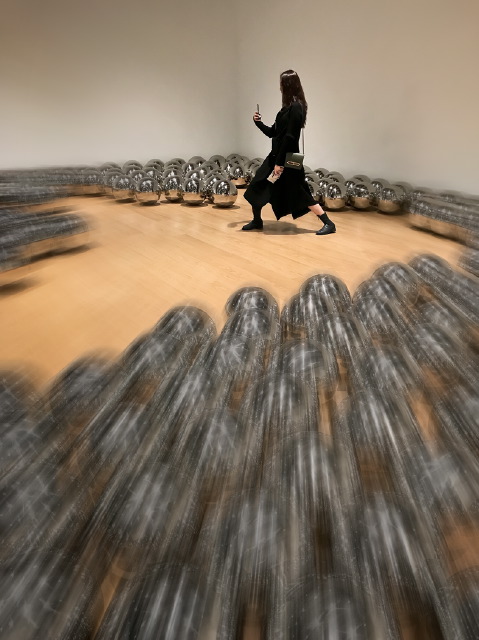 Posture. Seen at the excellent Space Shifters exhibition in the Hayward Gallery at London's Southbank Centre, in 2018. The stainless steel orbs are part of an installation by the Japanese artist Yayoi Kusama, originally staged back in 1966 but recreated several times since then in a variety of settings. I loved the pose of the Japanese lady photographing her friend in the middle of the installation and grabbed a couple of shots on my own iPhone. I'm impressed by the technical quality of the original image from a slowish exposure on such a small sensor, which needed very little adjustment in post-processing, but I decided – rightly or wrongly – to create a 'rushing' effect to add a little drama.