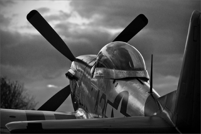 Ready. A P-51 Mustang, designed in 1940 by North American Aviation, seen against the darkening evening sky. Taken at a re-enactment evening run by Timeline Events at North Weald airfield in Essex.
