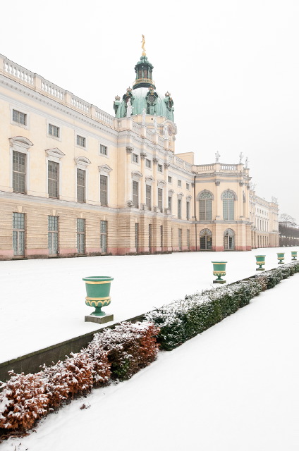 Schloss Charlottenburg, Berlin. On a brief visit to Berlin in January 2013 I called in to the Schlossgarten to see what the snow had made of it – there had been fine but persistent snow every night of my visit. There was almost no-one in the gardens apart from a few tentative joggers, and I spent an hour enjoying the white-out peace of these gardens on the edge of the city centre. Finally returning to Schloss Charlottenburg itself I lined up this delicate wideangle shot (25mm equivalent) vanishing off towards infinity. In competition the judge didn't like it, at all.