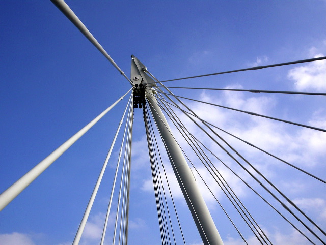 Highly Strung. Looking up at the supporting wires of the Hungerford footbridge, crossing the river Thames from Charing Cross station to the Royal Festival Hall, in London. Just a pattern picture, with the clouds conveniently behind the fan of the lower wires. Sky darkened a bit and the saturation somewhat increased.