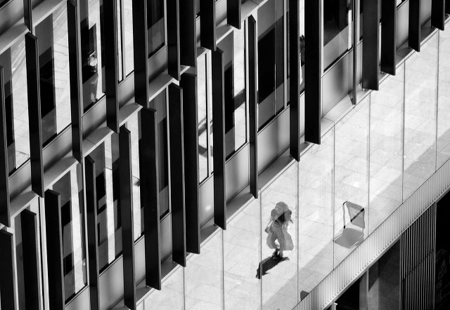 Walking By. I always enjoy overhead views: here in London with strong contre jour lghting, I've picked out some architectural detail in a modern building with a 300mm (35mm equivalent) lens. The lady walking by with her flowing trousers blowing in the wind is actually on a pavement out of the picture to the right – her reflection in the glass front of the building gives her a slightly distorted and rather ghostly appearance. She's positioned somewhere between one-third of the way across the image and the Golden Mean, in an attempt to keep all the critics happy!