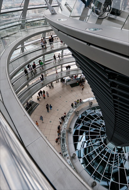 Looking Down. There are interesting photo opportunities everywhere in the dome of the Berlin Reichstag – home of the Bundestag, the German parliament – which was designed by British architect Norman Foster and completed in 1999. This is a fairly straight shot from near the top of the spiral walkway, but taken with the Nikon 12-24mm lens at 12mm – equivalent to 18mm on 35mm film – to emphasise the height of the space, and to make the most of the curve of the walkway on the left against the stack of adjustable mirrors on the right. I think the glimpse of the wheelchair top right helps to hold in that corner, but I might get complaints about (deliberately) cutting off the top of the wheel!