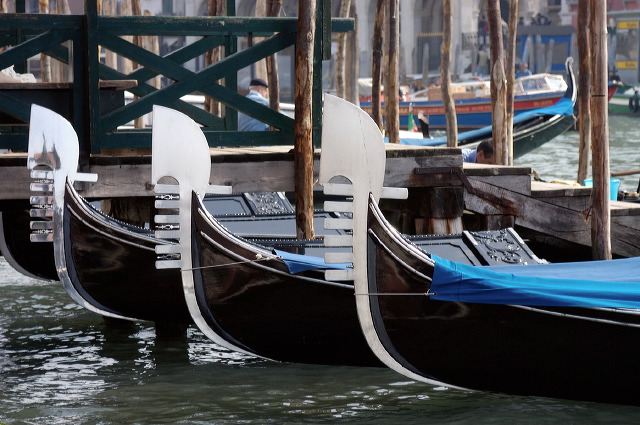 Bow 'flags' (ferri) of gondolas moored on the Grand Canal in Venice. The six projections of the ferro symbolise the six districts (sestieri) of the city.