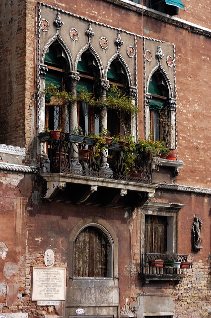Part of an old red brick building with stone Moorish style windows and a balcony in Venice.