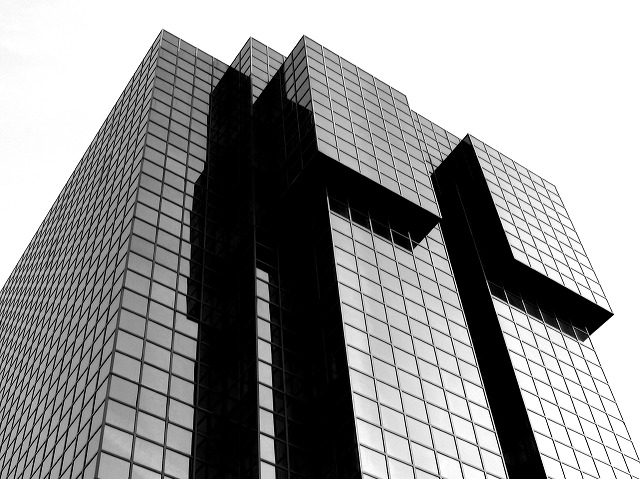 Block. Taken as part of the Walk by the Thames series in the very early days of the Nikon D100. A colour original, obviously (the full frame shown on the right), but it seemed to be crying out to be printed in monochrome. So I converted it in Photoshop, pushing the sky to white and the dark shadows to a solid black; there's still a good tonal range across those acres of glass panels though. Plus a crop off the left. A definite improvement IMHO.