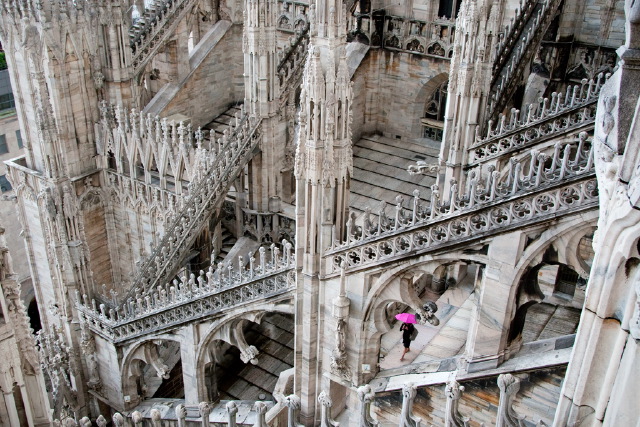Flying Butresses, Milan Cathedral. Milan was the first stop on my tour of Italy in 2010, affectionately referred to as Grand Tour II and documented on the Grand Tour Blog. I took a few photos inside the Duomo – Milan's enormous five-aisle cathedral – but it's very dark inside, in stark contrast to the highly decorated pinky-white marble exterior, and photography (which is not officially allowed but everyone is doing it) is not helped by ugly bright mercury lights high up at roof level. It's impressive, but not to me very attractive.
