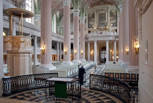 Nikolaikirche, Leipzig. The Nikolaikirche has a remarkable white and pink and pastel green leafy interior, dating from the late 18th century and a complete contrast to the sombre and difficult-to-photograph mediaeval exterior. It was the rallying point for protestors during the Wende, the peaceful revolution that led to the end of Communist rule and ultimately to German reunification.