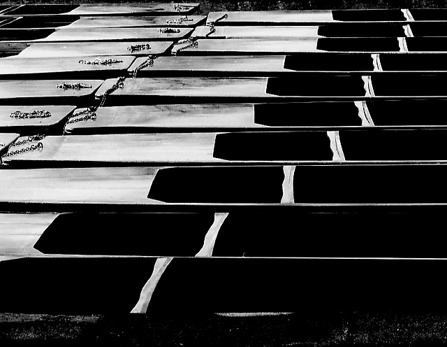 Punters' Pattern. Looking across a fleet (?) of punts chained up for the winter, on the River Cam in Cambridge.