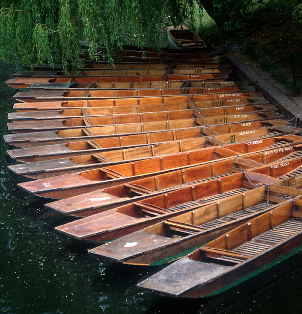 Out of Season. A nice arrangement of punts on the river in Cambridge, England, during the winter when no-one wants to hire them. Shot on transparency film, but the picture actually works better as a print than a slide.